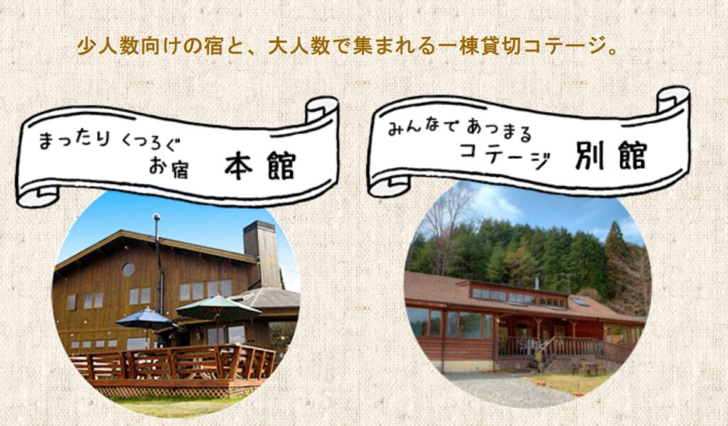 少人数向けの全5室の食事付き「お宿」と、みんなで集まれる「別館・一棟貸切コテージ」の2つの施設からなる宿泊所です。
