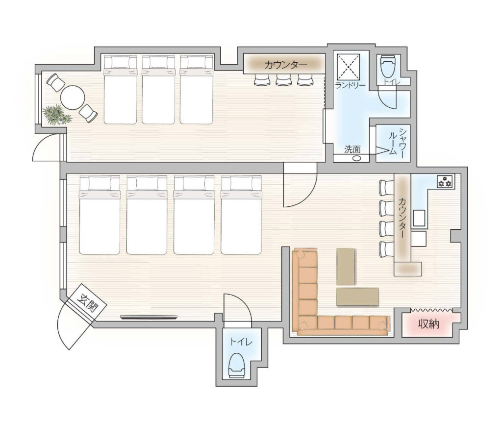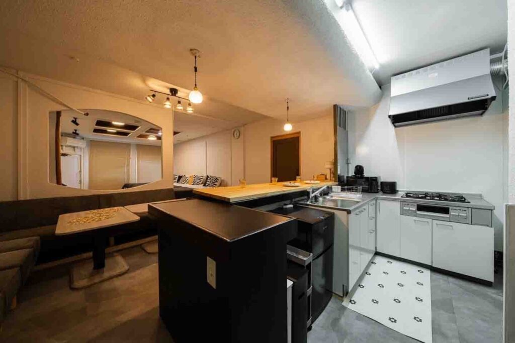 お部屋は広々としており、洋室1(ベッド4台)と洋室2(ベッド3台)の2つに分かれております。計7台のベッドをご用意しております。キッチンには冷蔵庫、電子レンジ、炊飯器に加え、調理器具も完備しております。お子様のおもちゃや椅子もご用意しております。