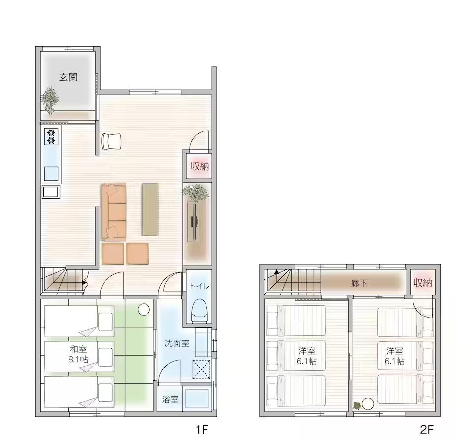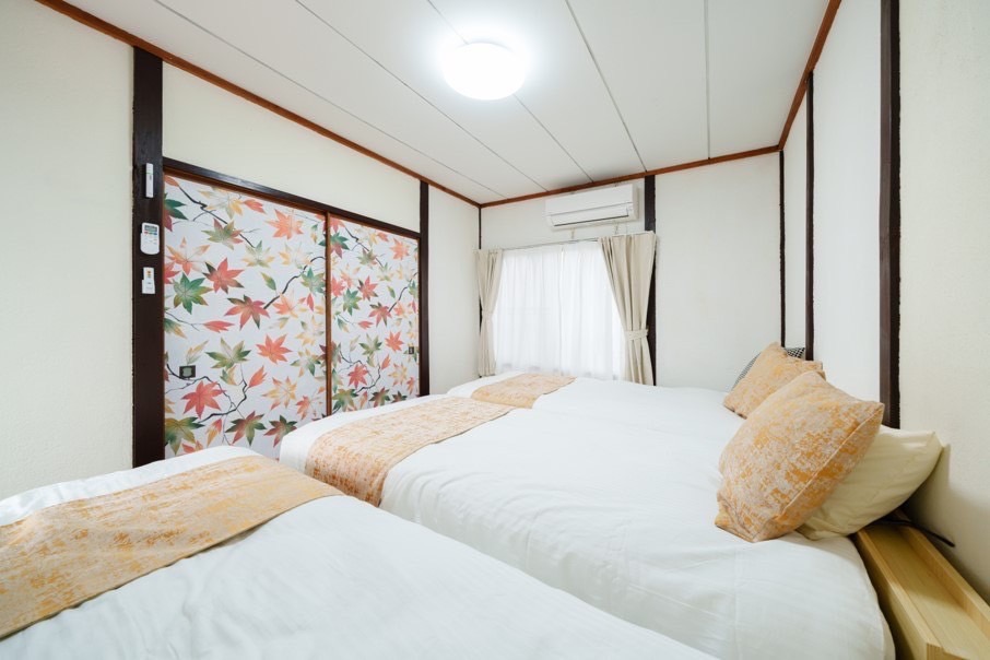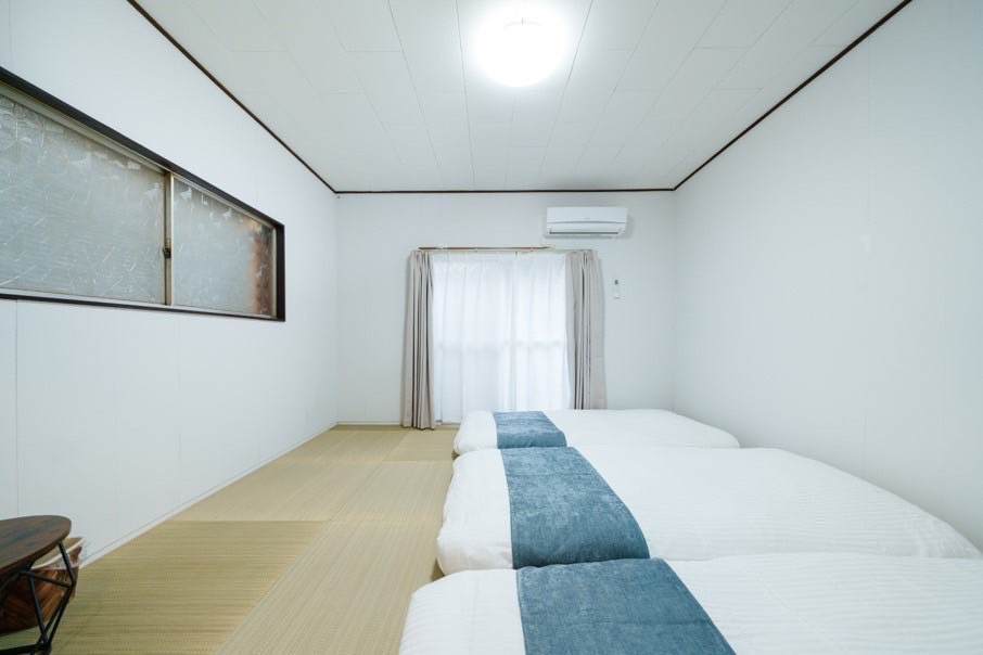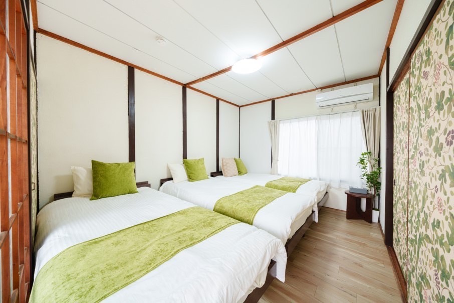 1階には和室(敷布団3台)とリビング、2階には寝室2部屋(ベッド6台)をご用意しております。リビングのソファーはベッドとしても使用可能で、最大10名様までご宿泊いただけます。