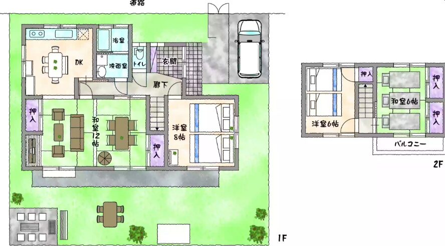 ●大家族、ファミリー、カップル、お友達同士向けの12人まで宿泊可能、無料駐車場2台(敷地内1台・敷地外1台)。