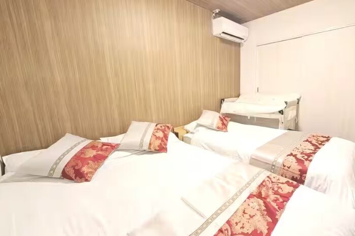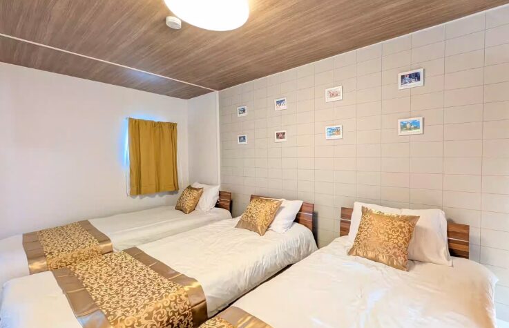 寝室3、シングルベッド × 4、ダブルベッド ×1、マットレス+敷布団 ×3、ベビーベッド ×1