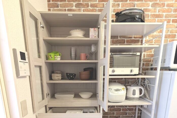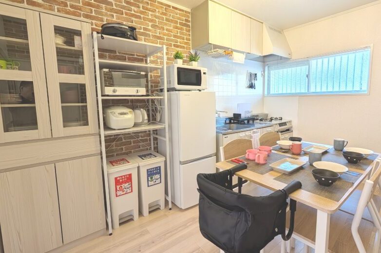 【設備】フリーWi-Fi、全ての部屋にエアコン、冷蔵庫、洗濯乾燥機、電子レンジ、水洗トイレ(ウォシュレット)、炊飯器、電気ケトル、ヘアードライヤー、ホットプレート、オーブン、フライパン、電気グリル鍋、食器類、掃除機