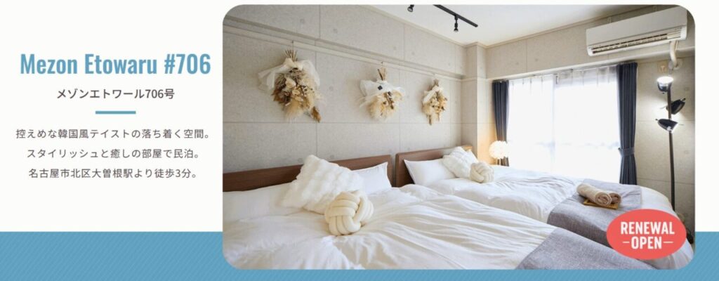 | Mezon Etowaru #706 | 1泊22,000円~ ※3名まで同一料金 | 最大8名 | 大曽根駅 徒歩約3分 | ・韓国風女性向けインテリア ・ドーム利用に便利 ・駐車場なし |